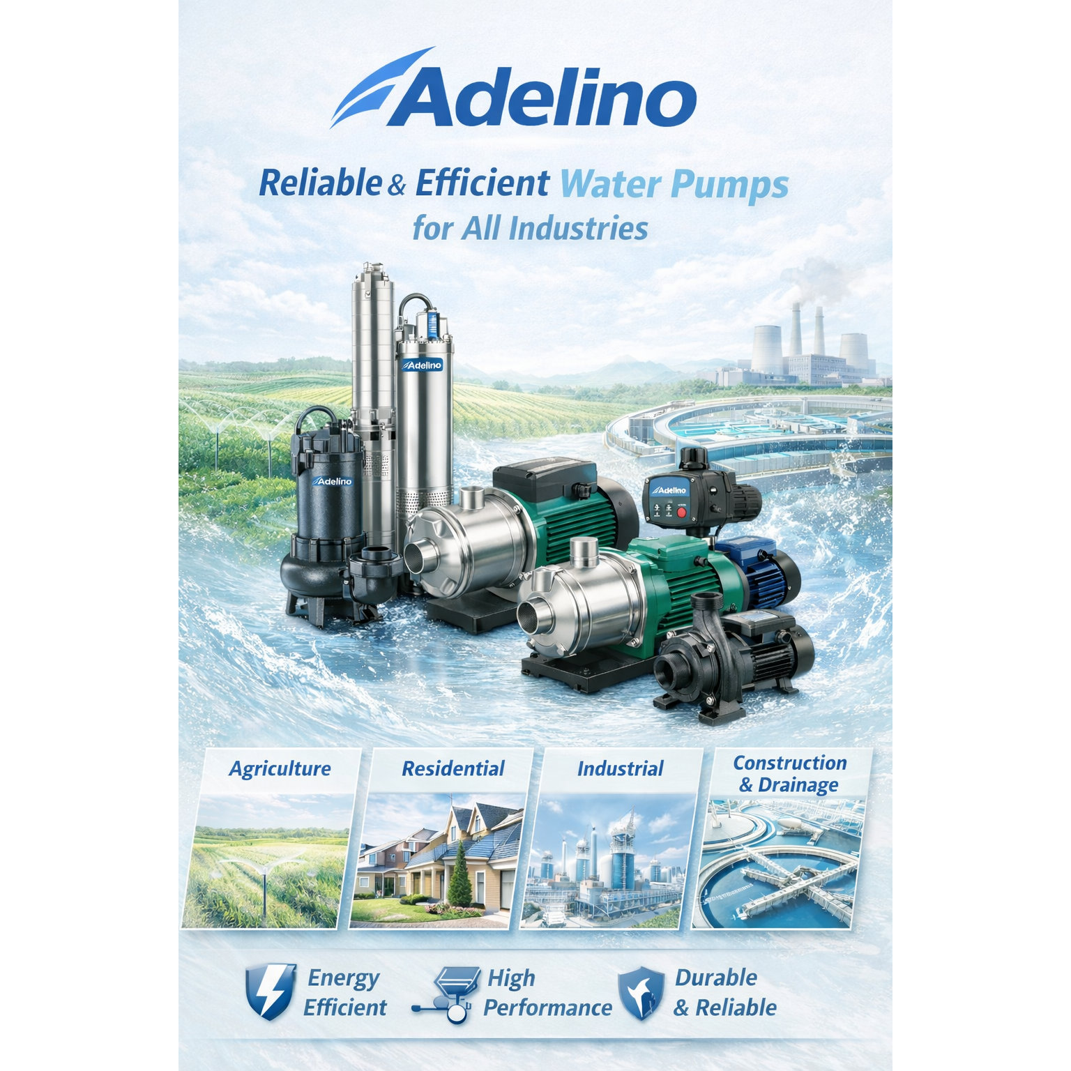 Reliable & efficient Adelino Pumps designed for all industries. Ideal for agriculture, residential, industrial, and construction applications, offering high performance, energy efficiency, and long-lasting durability.