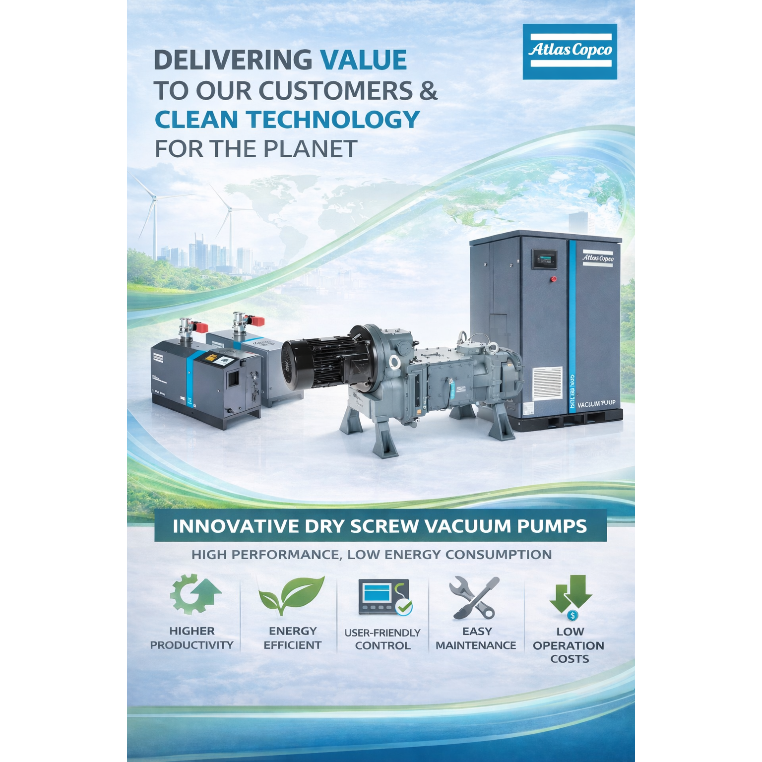 At Atlas Copco Vacuum , delivering value to our customers and clean technology for the planet drives our innovation. We invest in technology like our range of dry screw vacuum pumps that deliver benefits like higher productivity, minimized energy consumption, operator-friendly control, easy maintenance, and lower operation costs.