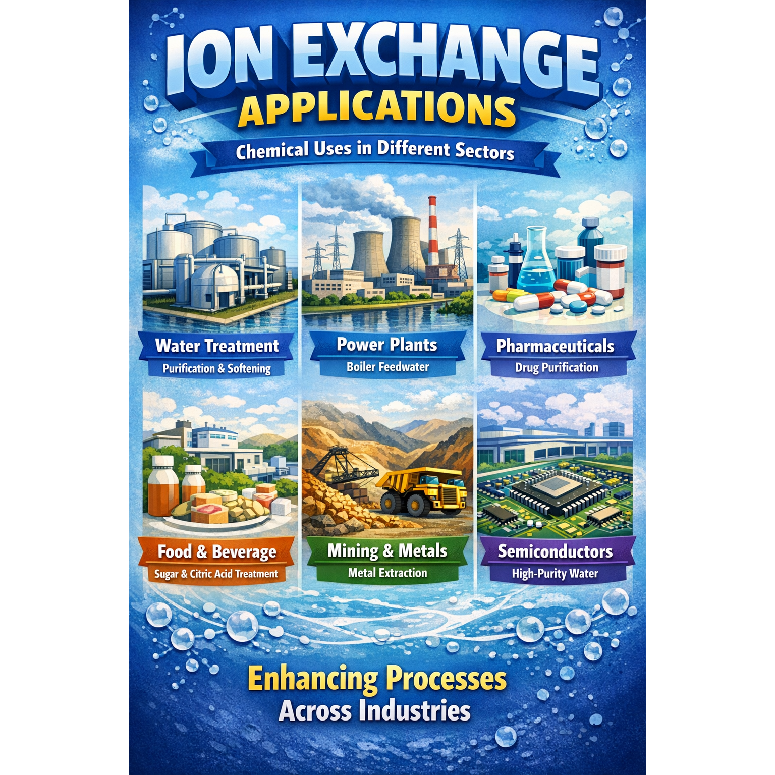 Ion Exchange (India) Ltd. chemicals are widely used across multiple sectors to improve water quality, protect equipment, and ensure efficient industrial processes. In manufacturing industries, they help treat boiler and cooling-tower water, preventing scale formation and corrosion that can damage machinery. Power plants rely on these chemicals for demineralizing feed water and polishing condensate so turbines and systems operate safely and efficiently. In the pharmaceutical sector, they are essential for producing ultra-pure water that meets strict quality and safety standards. The food and beverage industry uses them to purify ingredient water, soften process water, and maintain consistent product quality. Textile manufacturers depend on them to remove hardness ions from water, allowing uniform dyeing and better fabric finishing. Electronics and semiconductor industries require highly purified water free from dissolved ions to prevent contamination during production. Municipal water treatment facilities use ion exchange chemicals to purify drinking water, remove heavy metals, and recycle wastewater. In the oil, gas, and petrochemical sectors, these chemicals help treat produced water, control scaling and corrosion, and support desalting processes. Overall, ion exchange chemicals play a vital role in maintaining water purity, improving system performance, and extending equipment life across a wide range of industries.